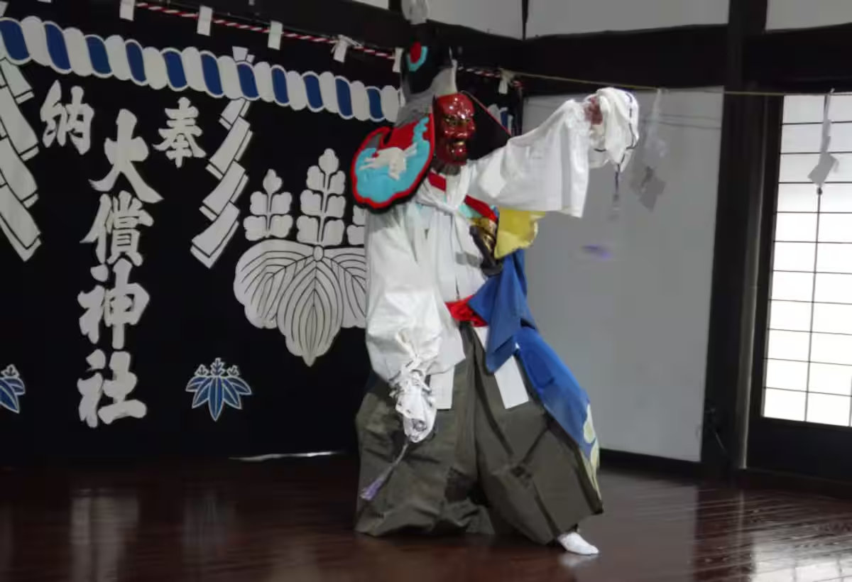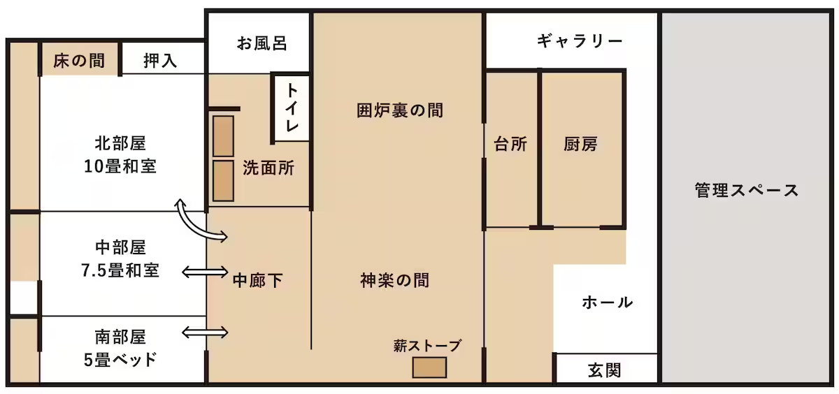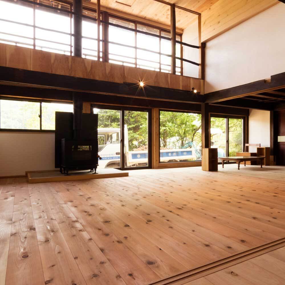 A high-ceilinged room with a wood-burning stove, designed to accommodate performances of the local Hayachine Kagura dance.