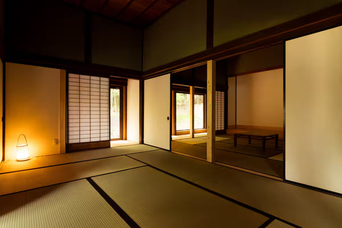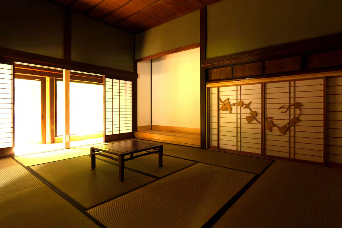 A tatami room featuring a plaster wall and a tokonoma alcove. Characterized by grape-patterned shoji doors, creating a calming space.